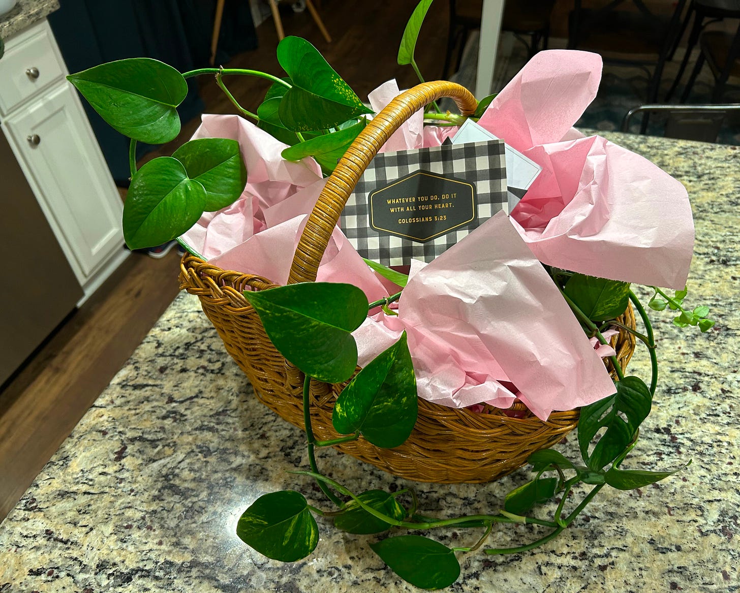 One of our friends brought me this thrifted harvesting basket with cuttings of her… plant…. I don’t actually know the name of this plant. But I love it!! And the fact that she brought me a thrifted basket and cuttings from her own plant means she somehow knows exactly the sort of homemaking journey I’m on without ever having read a word of this journal.
