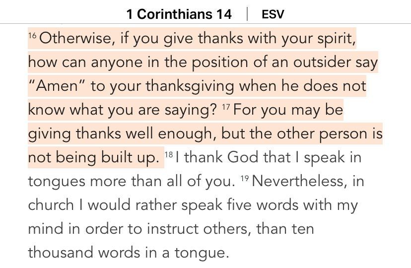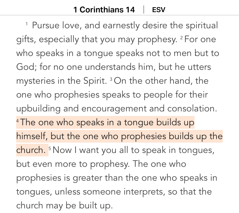 Again, tongues as a private prayer language or as a means of edifying oneself is a wrong interpretation of what Paul is saying here. Rather, he is saying that prophesying is to be especially desired because it builds up the church on its own. Whereas speaking in tongues, though also a desirable gift, is LESS desirable because it requires an interpretation to be of benefit to the church, which is THE point of the gifts of the Spirit.