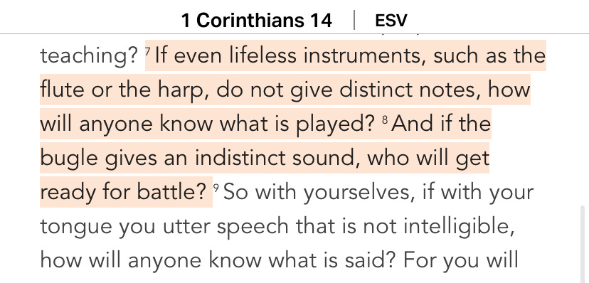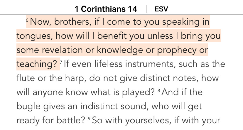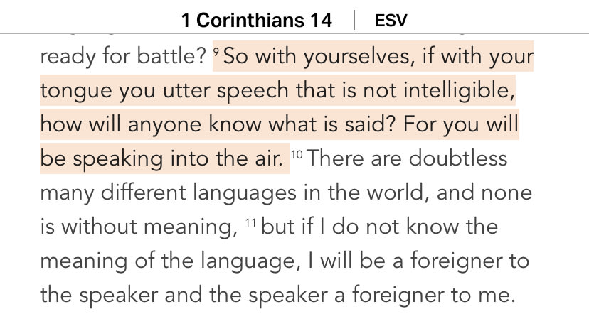 A tongue with no interpretation is like a note separated from its symphony. Nobody can hear the song of the gospel (echos of Revelation 14:3…) in a sound which holds no meaning to the hearer, in a sound where there is no revelation of Christ.
