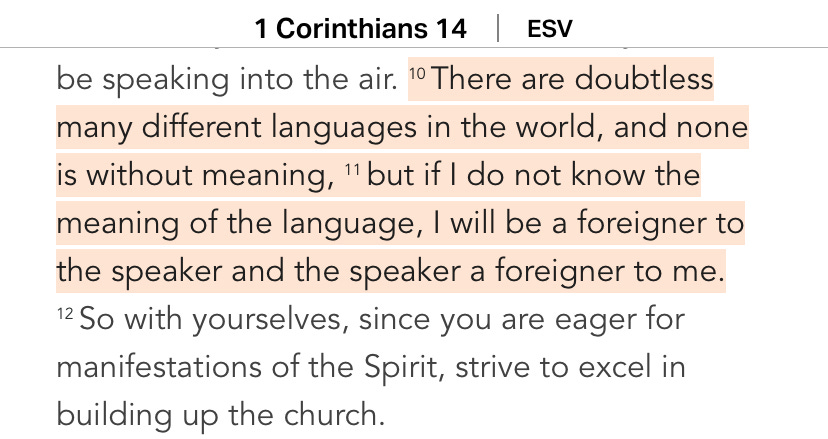 This drives home the point that “tongues” are known and spoken languages. Not gibberish or “ecstatic speech” (commonly seen in pagan religion) as is prolifically seen in the modern charismatic movement.
