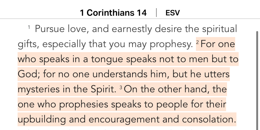 Paul is not saying that the person speaking in a tongue IS TO speak to God, as if that were the purpose of the gift, but that God is the only one who knows what he is saying. This is also what is meant by “he utters mysteries in the Spirit.” A mystery with no revelation is of no spiritual benefit to anyone involved. The Spirit is working, but the meaning remains concealed.