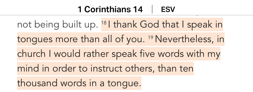 And even having this gift, he prefers the gift of prophesying or teaching in the commonly understood language for one sentence so that others may benefit rather than to go on for hours in a tongue that no one understands.