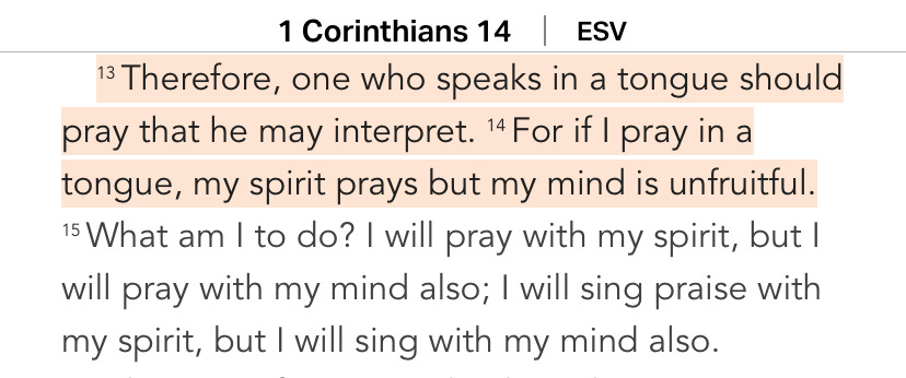 But what is the meaning of verse 14? This is another portion of this chapter that some will use to justify the gift of tongues being used for self-edification or as a private prayer language—to say that a person is meant to pray in the spirit with no benefit to the mind; that there is somehow a special benefit to this. However, the point Paul is making is exactly the opposite.