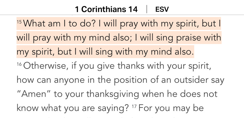 Instead, Paul says you are to pray with your spirit but also with your mind. Sing to the Lord with your spirit and your mind.