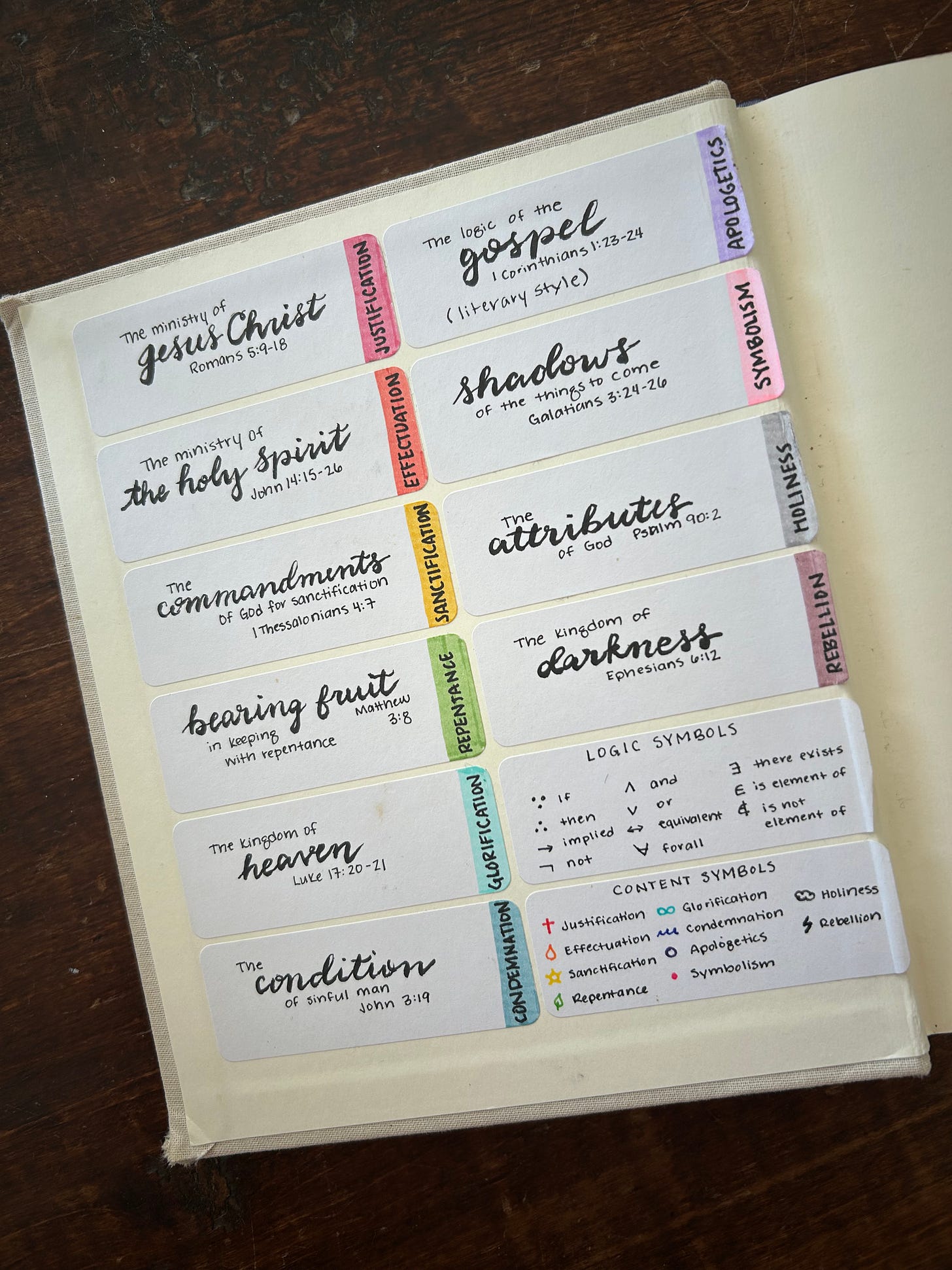 I have a little journaling Bible I got a couple of years ago that is beautiful and I have really enjoyed working in it. Below you can see my system of colors and symbols I use to break passages down into their gospel components.