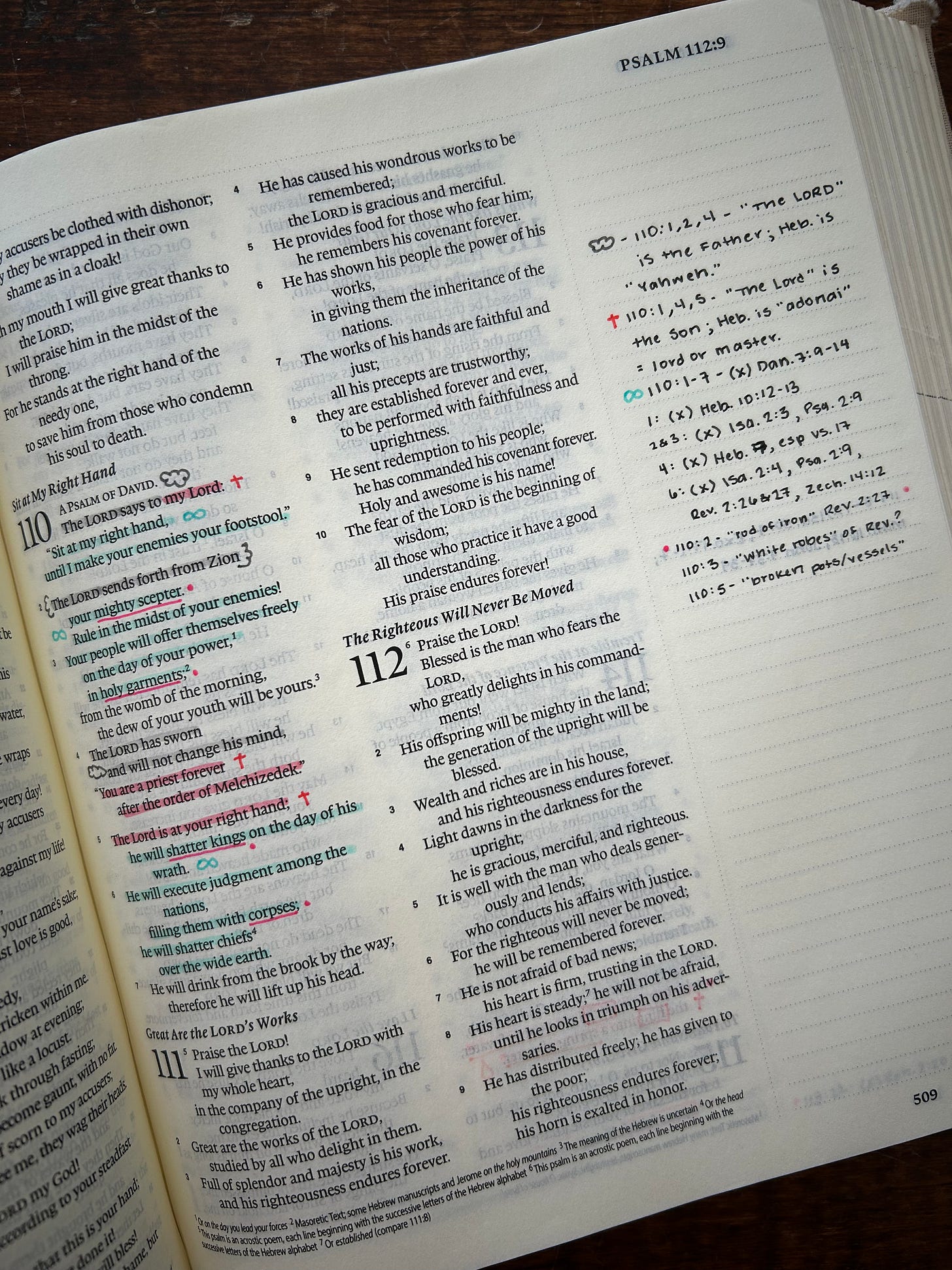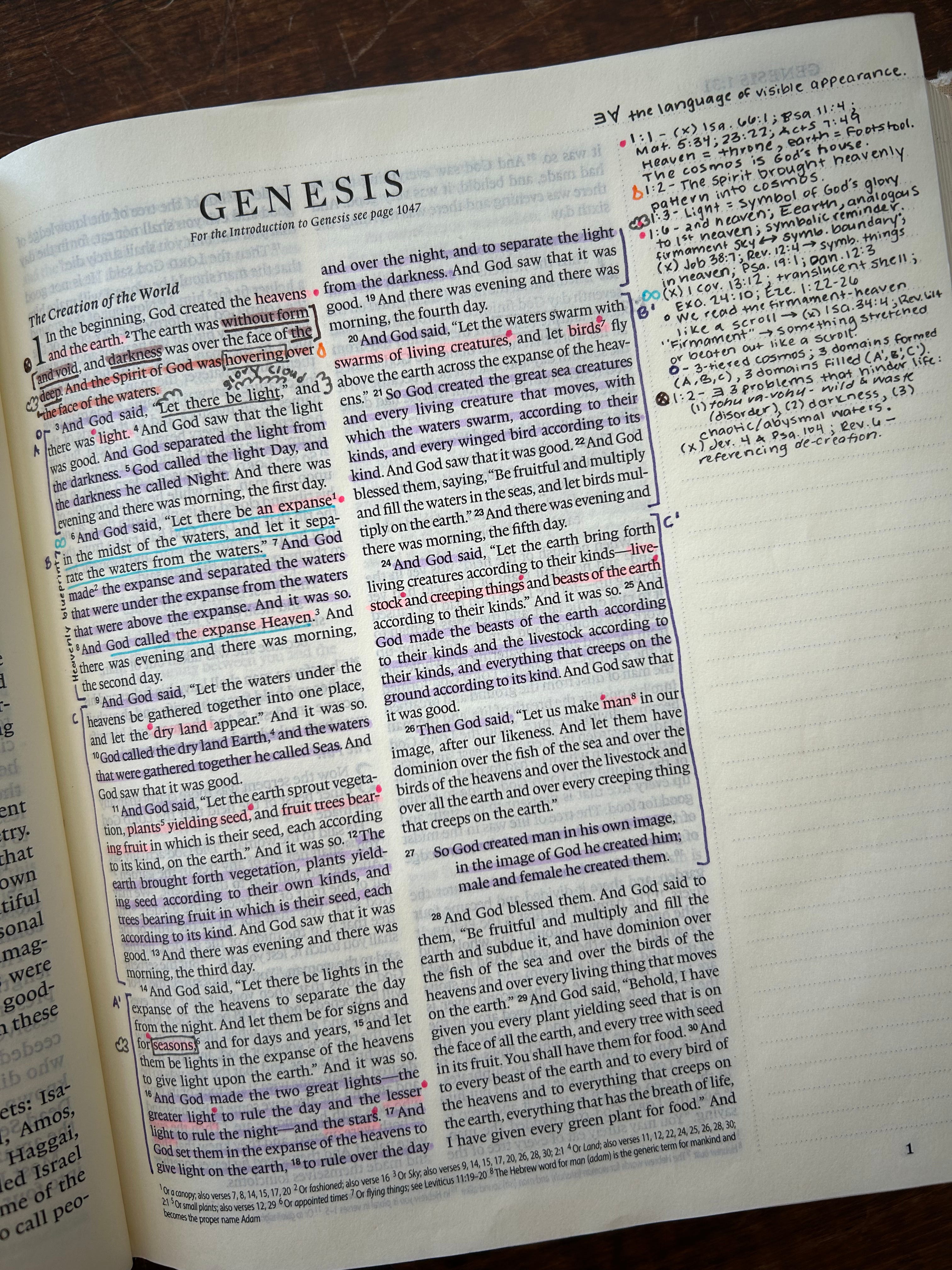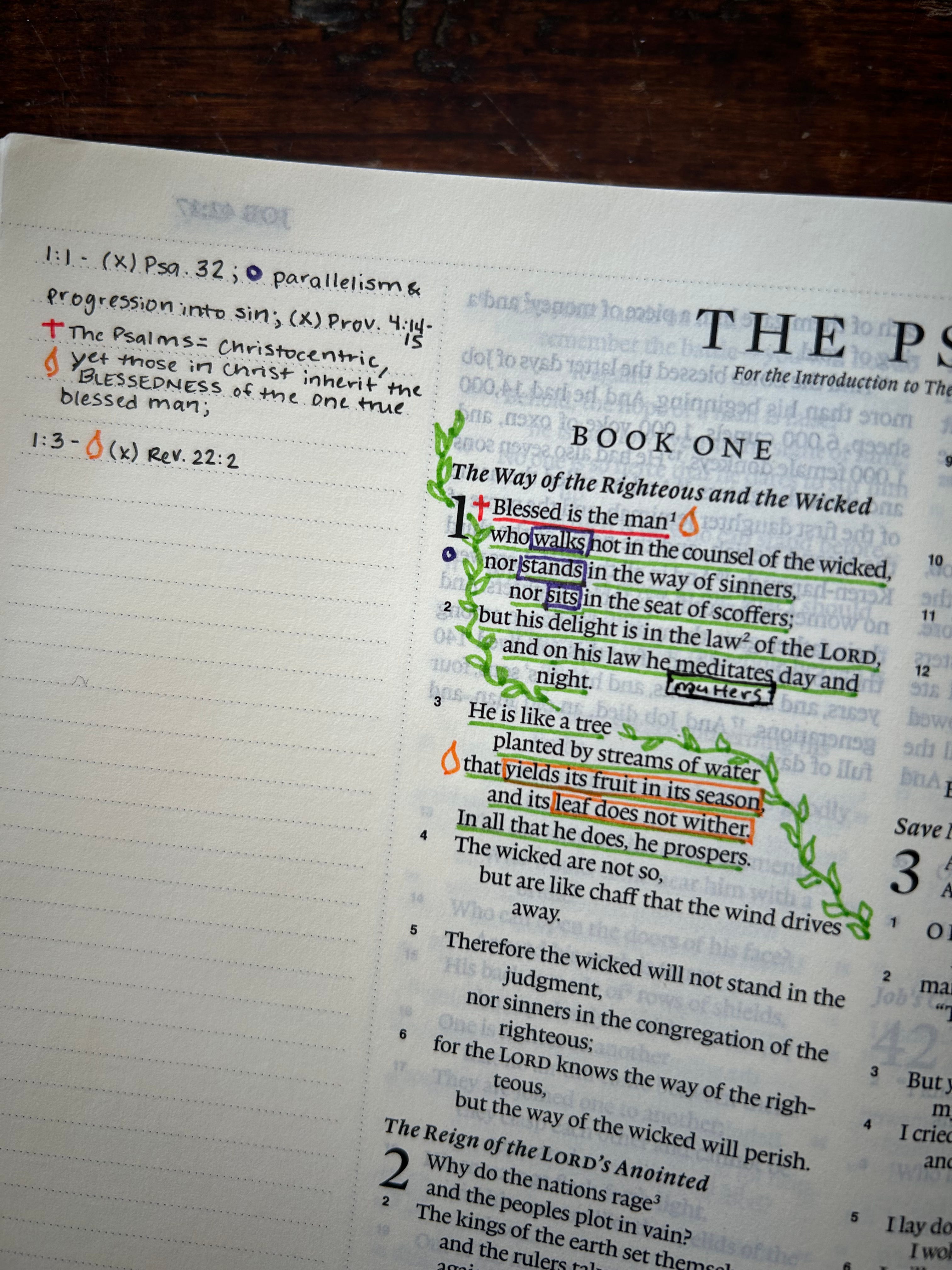 For example, in Psalm 1:1 I have marked in red Christ’s role in the verse, marked with the orange symbol the Holy Spirit’s role, and cross-referenced Psalm 32, which expounds on the nature of the blessed man, specifically that we inherit through the work of the Holy Spirit what THE Blessed Man achieved. I’ve also marked in purple a literary device used to make the point. And all of that is a subset of the green leaves which marks the theme of the larger passage—that the blessed man is one who bears fruit in keeping with repentance.