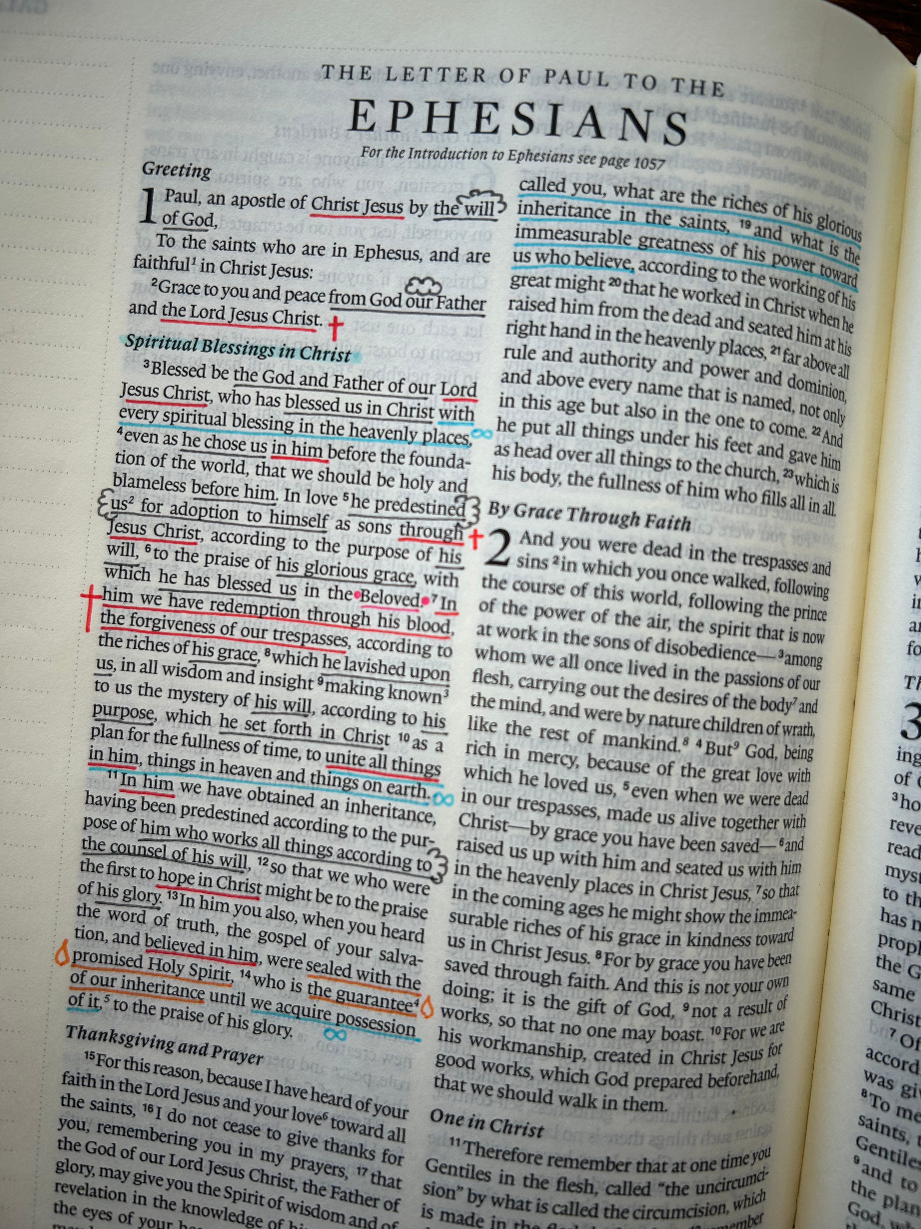 For example, red highlights the ministry of Christ, orange is the work of the Holy Spirit, and yellow marks explicit commandments. Each color has a coordinating symbol just for versatility and to help me remember what each color represents. And the symbols also serve to connect the passage with the notes relating to it in the margins.