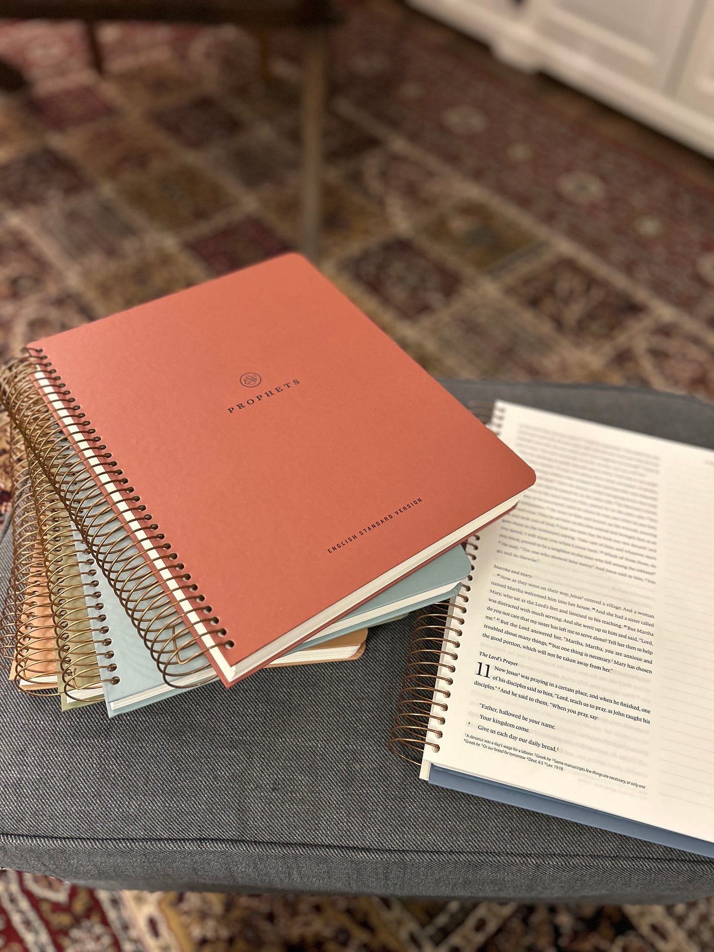 For that reason, I’ve been seeking a larger journaling Bible so that I can fit all my notes on the page. (I write very very small.) I found one I loved and my parents got it for me for my birthday (which is in just a couple of weeks!). It comes in five volumes, so if you are looking for something to fit all your study notes in, you would probably be as excited about this as I am!