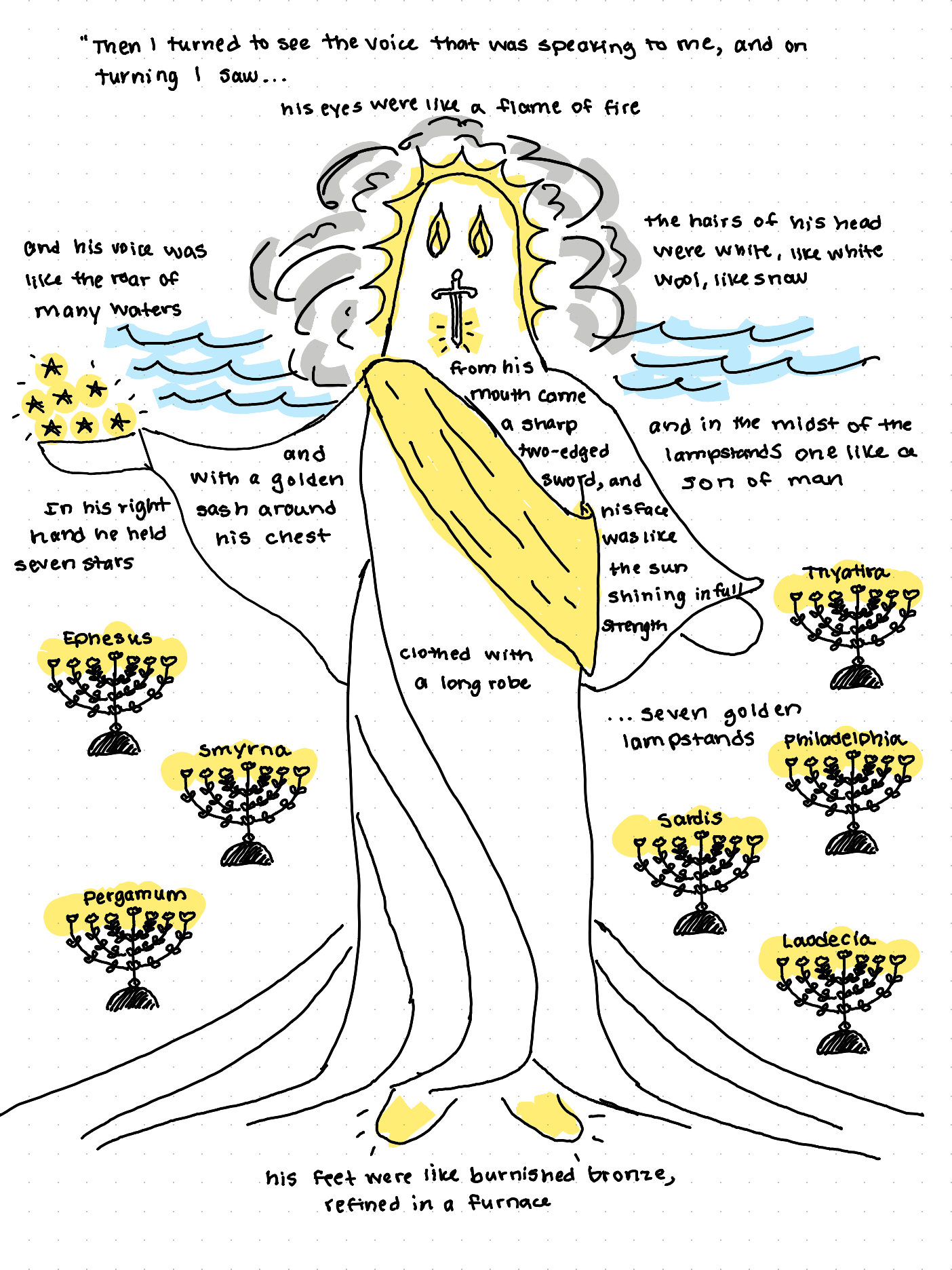 “Then I turned to see the voice that was speaking with me. And having turned, I saw seven golden lampstands, and among the lampstands was One like the Son of Man, dressed in a long robe, with a golden sash around His chest. The hair of His head was white like wool, as white as snow, and His eyes were like a blazing fire. His feet were like polished bronze refined in a furnace, and His voice was like the roar of many waters. He held in His right hand seven stars, and a sharp double-edged sword came from His mouth. His face was like the sun shining at its brightest.” - Revelation 1:12-16